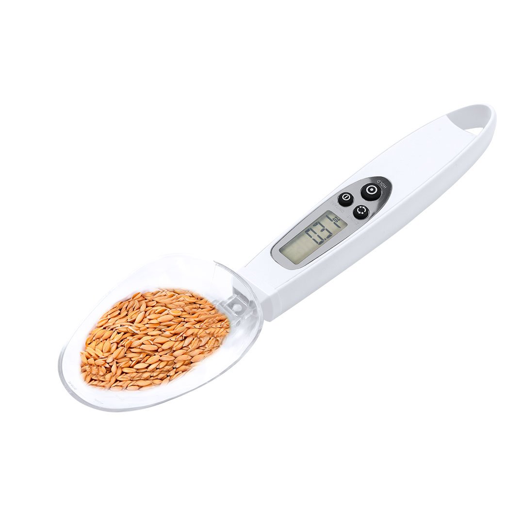 Práctica báscula digital con cuchara, válida para líquidos y sólidos. Incluye 2 cucharas intercambiables y pantalla digital LCD situada en el mango, mostrando el pesaje con una precisión de 0,1g. Botón para mostrar el peso en gramos (g), onzas (oz), o mililitros ( ml), con función de memoria y posibilidad de pesar dos ingredientes. Ambas cucharas llevan grabada una escala de medición adicional para líquidos: la cuchara pequeña desde 5 ml hasta 25 ml; y la cuchara grande desde 10 ml hasta 50 ml. Con manual de instrucciones en español e inglés. Alimentada por pila de botón (incluida) y presentada individualmente en caja de diseño kraft.