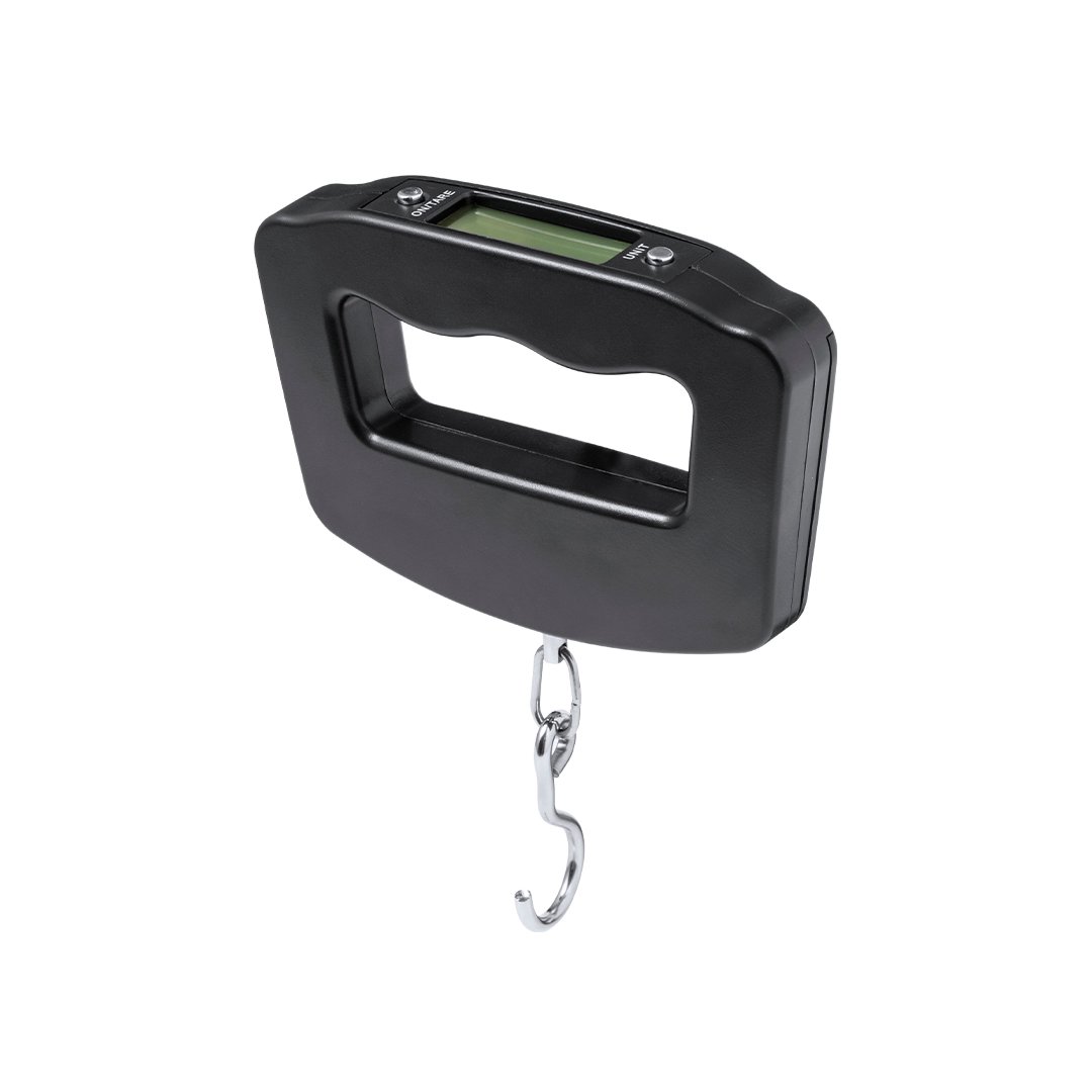 Báscula digital de mano portátil. De diseño ergonómico para adaptarse a la mano y facilitar la visualización de su pantalla LCD. Con botón ON/OFF, función TARA, y varias unidades de medida: gramos (g), kilogramos (kg), libras (lb) y onzas (oz). Con gancho metálico para facilitar el pesaje de diversos objetos y un peso máximo de 50kg. Incluye instrucciones en español e inglés y está alimentada por 2 pilas AAA (no incluidas). Presentada individualmente en caja de diseño kraft.