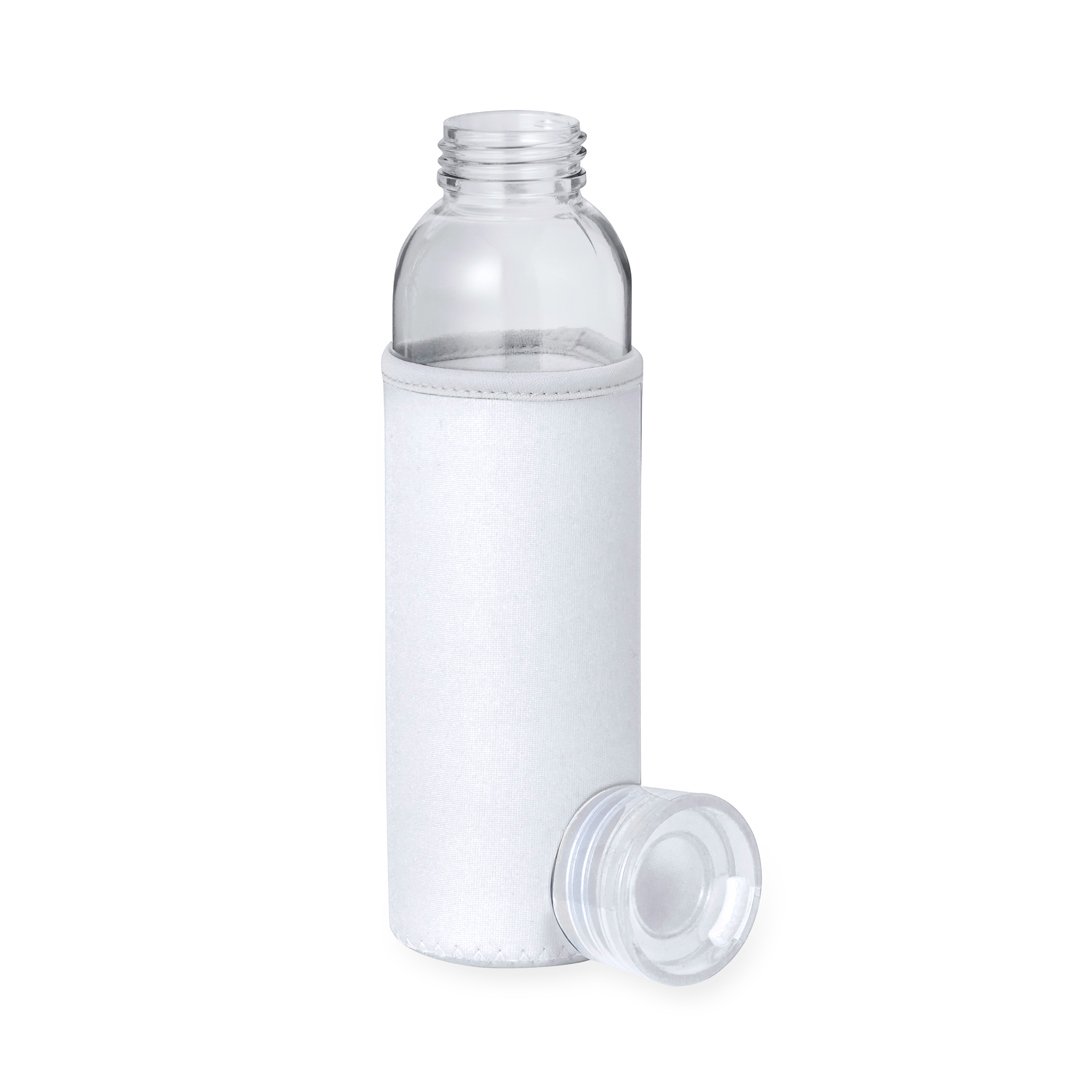 Bidón de 500 ml de capacidad. Cuerpo fabricado en cristal, con tapón a rosca y práctica asa de silicona para un fácil transporte. Incluye funda de soft shell a juego. Disponible en variada gama de colores y presentado en caja individual de atractivo diseño kraft.