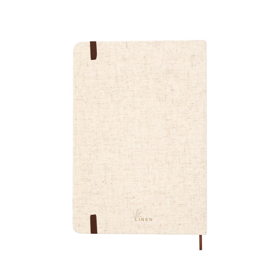 Bloc de notas confeccionado en suave lino. De tapas rígidas, marcapáginas, banda elástica de color marrón y 80 hojas lisas color natural. Con logotipo Lino en contraportada. Presentado en bolsa individual. Elaborado con elementos vegetales para así fomentar la utilización de materias primas naturales y reducir las emisiones contaminantes.