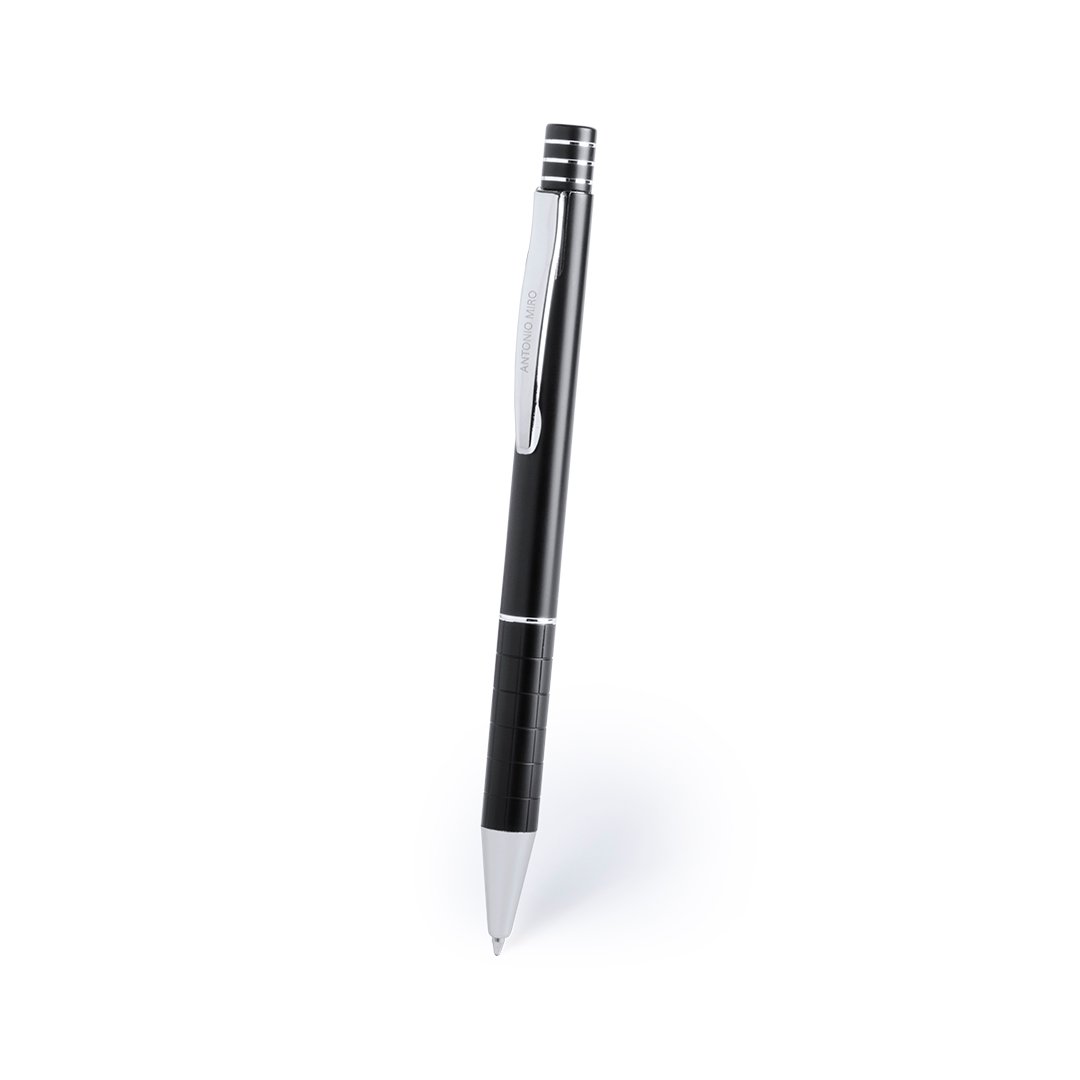 Bolígrafo de Antonio Miró de elegante diseño y suave cuerpo en aluminio con accesorios en color plateado. De mecanismo pulsador, con parte superior anillada, original clip metálico y presentado en estuche individual de aluminio negro con logotipo de la marca. Tinta azul.