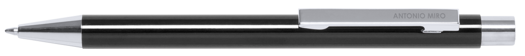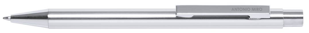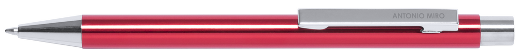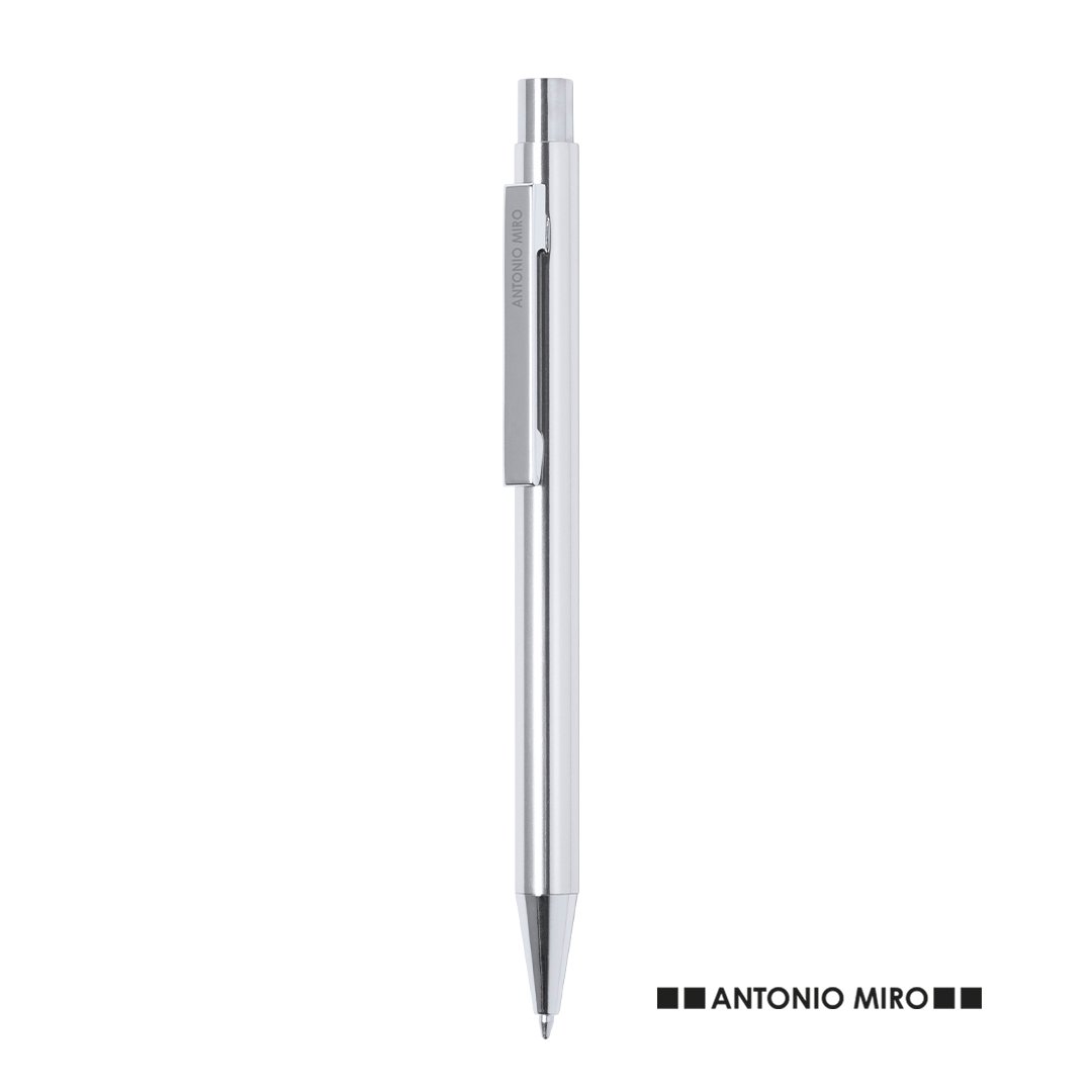Bolígrafo de Antonio Miró con cuerpo en aluminio de variada gama de vivos colores y en color plateado. De mecanismo pulsador y presentado en bolsita don logotipo de la marca. Tinta azul.