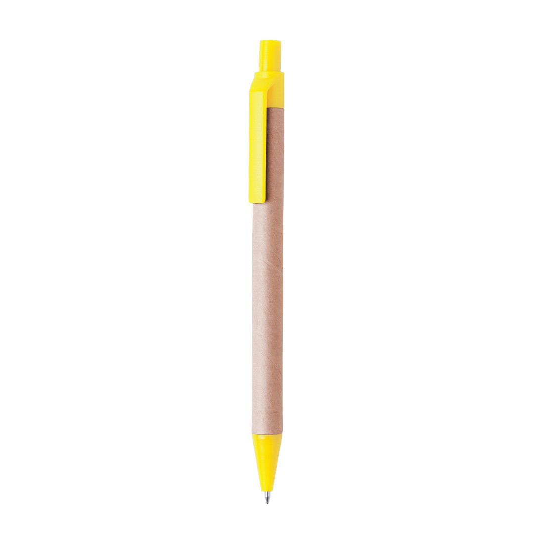 Bolígrafo de mecanismo pulsador en original combinación de cuerpo en cartón reciclado de color natural y accesorios en vivos colores. Tinta azul.
