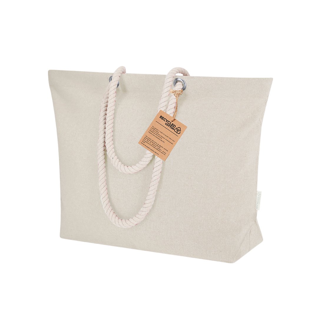 Bolsa confeccionada principalmente en Algodón Reciclado de 220g/m2. Con fuelle y asas largas de algodón en color natural y diseño trenzado. Incluye distintivo algodón reciclado.
