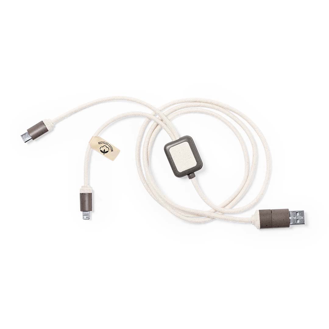 Cable cargador fabricado en fibra de café, con cables recubiertos en algodón reciclado. Conexiones de entrada Tipo C y USB, con salidas Tipo C, Lightning y Micro USB. 5V DC 2.4A. Con distintivos de fibra de café y algodón reciclado. Presentado en bolsa individual de diseño kraft con autocierre.La fibra de café es una solución circular que se obtiene de la utilización de los residuos producidos en la obtención del café. Una alternativa sostenible que favorece la reducción del uso de plásticos, ahorrando energía en su proceso de fabricación y contribuyendo al cuidado del medio ambiente. Disponible certificación GRS (Global Recycled Standard / Estándar de Reciclaje Global), que garantiza el origen reciclado del material usado para fabricar el producto.