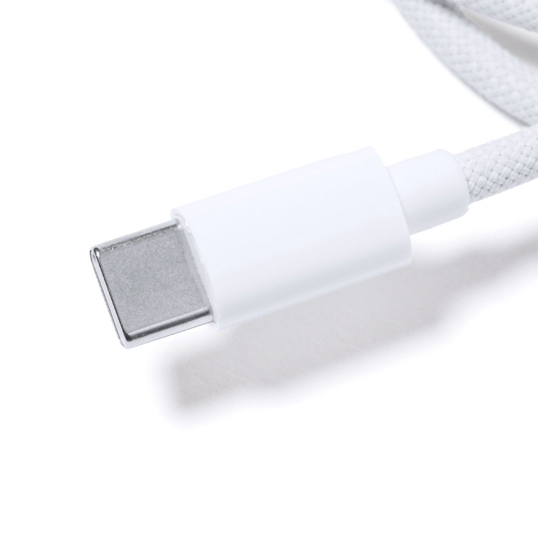 Cable cargador con conexión dual Tipo C. De 65W de potencia y apto para transferir datos. 100cm de longitud, con conectores de aluminio y presentado en atractivo estuche con una parte transparente y otra opaca. Con asa de transporte y presentado individualmente en bolsa reciclada.