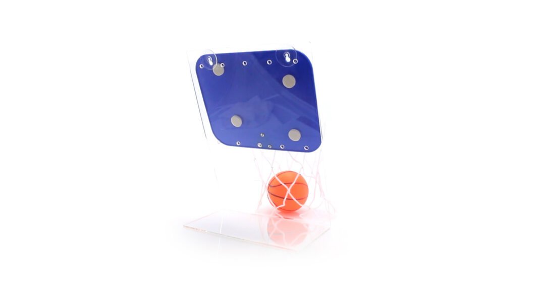 Canasta en PVC con tablero en vivos colores. Con pelota de minibasket incluida y ventosas en parte trasera para fijación.