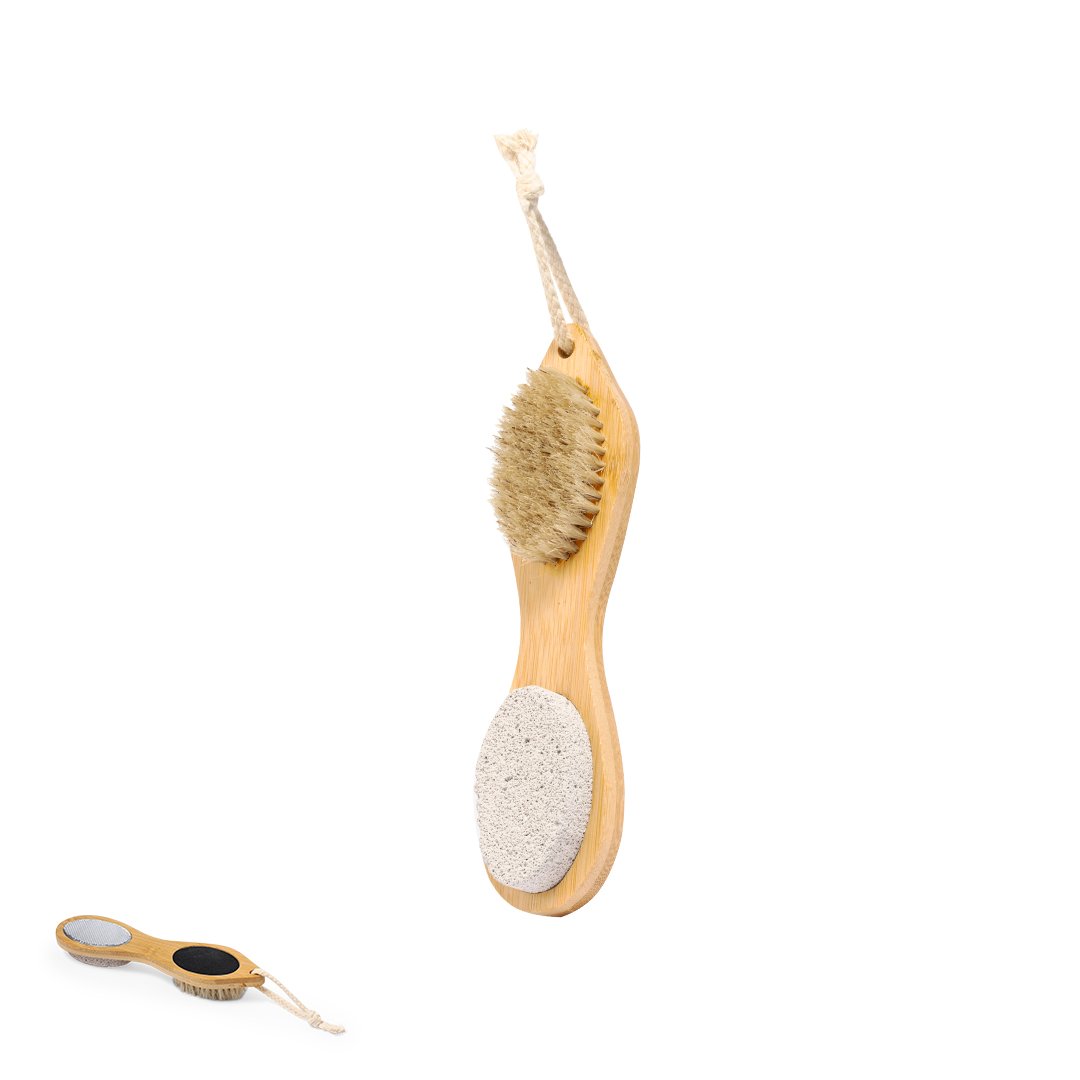 Práctico cepillo exfoliante en madera natural. Cuatro funciones diferentes en cada extremo del cepillo: en un extremo con piedra pómez y lija metálica; y en el otro extremo con lija natural y suaves cerdas. Con práctico cordón para colgarlo después de su uso.