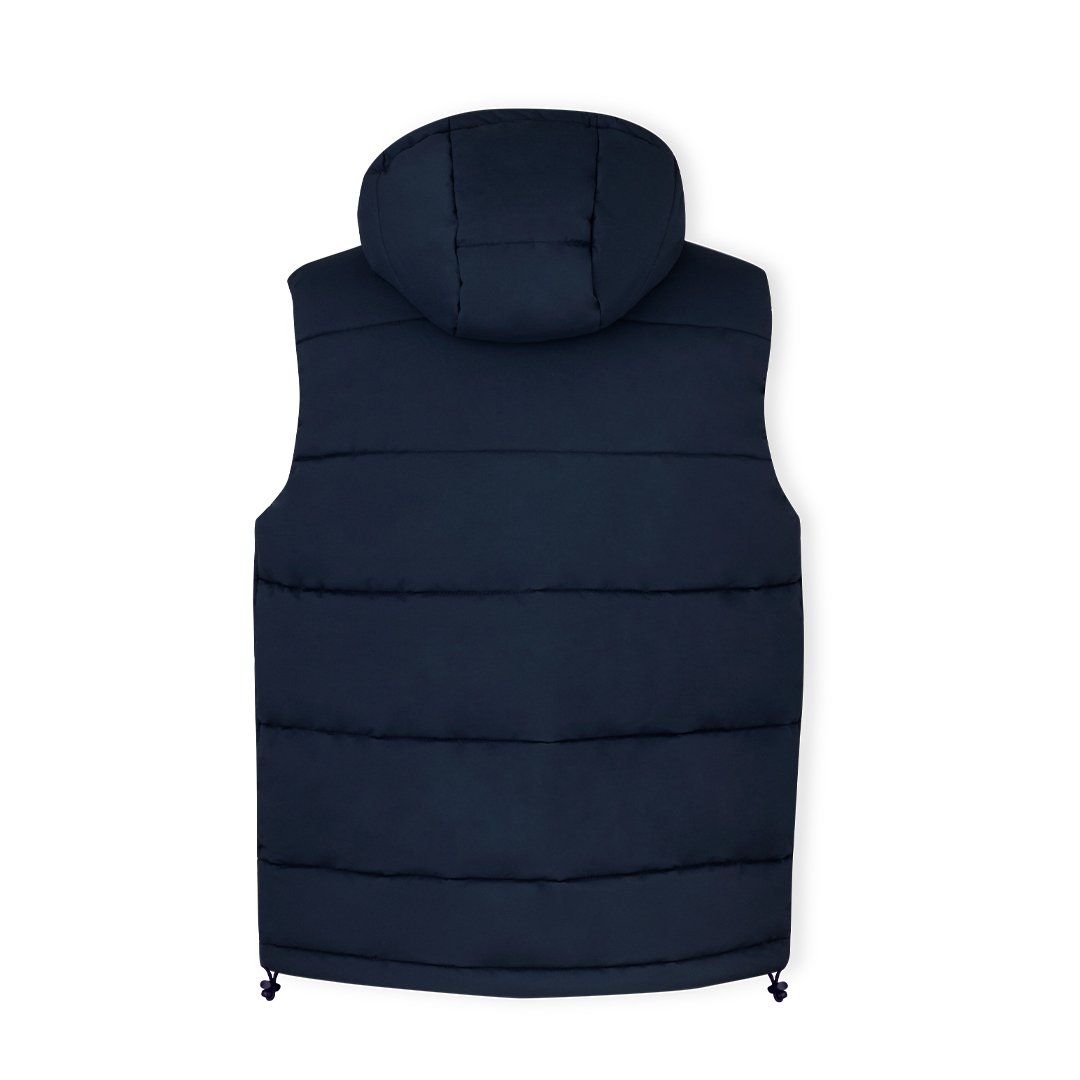 Chaleco con capucha, en cálido y suave material 100% poliéster. En material ligero, resistente al viento y al agua. Diseño de elegante construcción horizontal y acolchado, con capucha fija integrada. Doble cierre frontal de cremallera y corchetes. Bolsillos laterales con tiradores a juego y cordón ajustable en dobladillo. Disponible en tallas XS, S, M, L, XL, XXL.