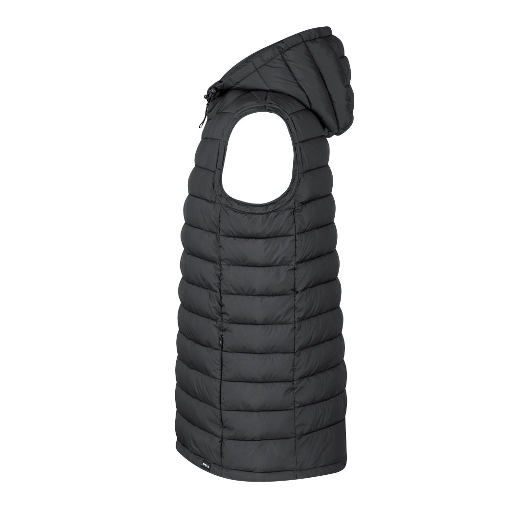 Chaleco unisex en cálido y suave material 100% RPET, con capucha ajustable mediante cintas elásticas. En material extra ligero efecto pluma, resistente al agua y cortavientos. Con acolchado interior, cremallera en cuello con tapeta y cinta en tirador, además de amplios bolsillos laterales con cremallera. Incluye práctica funda de transporte con cordón ajustable y etiqueta con logotipo RPET. Disponible en variada gama de colores y en tallas XS, S, M, L, XL, XXL.El material RPET se elabora a partir de plástico reciclado, para así fomentar la reutilización de residuos plásticos y ayudar a la sostenibilidad del planeta.