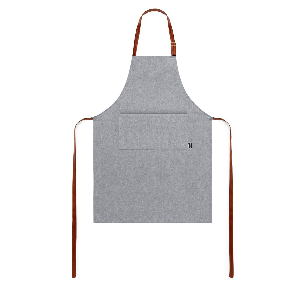 Delantal de línea nature en material RPET, elaborado a partir de plástico reciclado, para así fomentar la reutilización de residuos plásticos y ayudar a la sostenibilidad del planeta. De corte por debajo de la rodilla, con cintas de ajuste en resistente polipiel y amplio bolsillo frontal. Etiqueta en bolsillo con distintivo RPET.