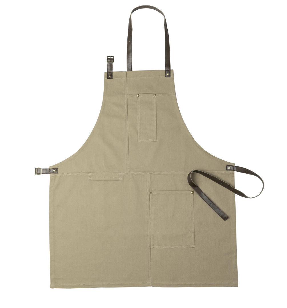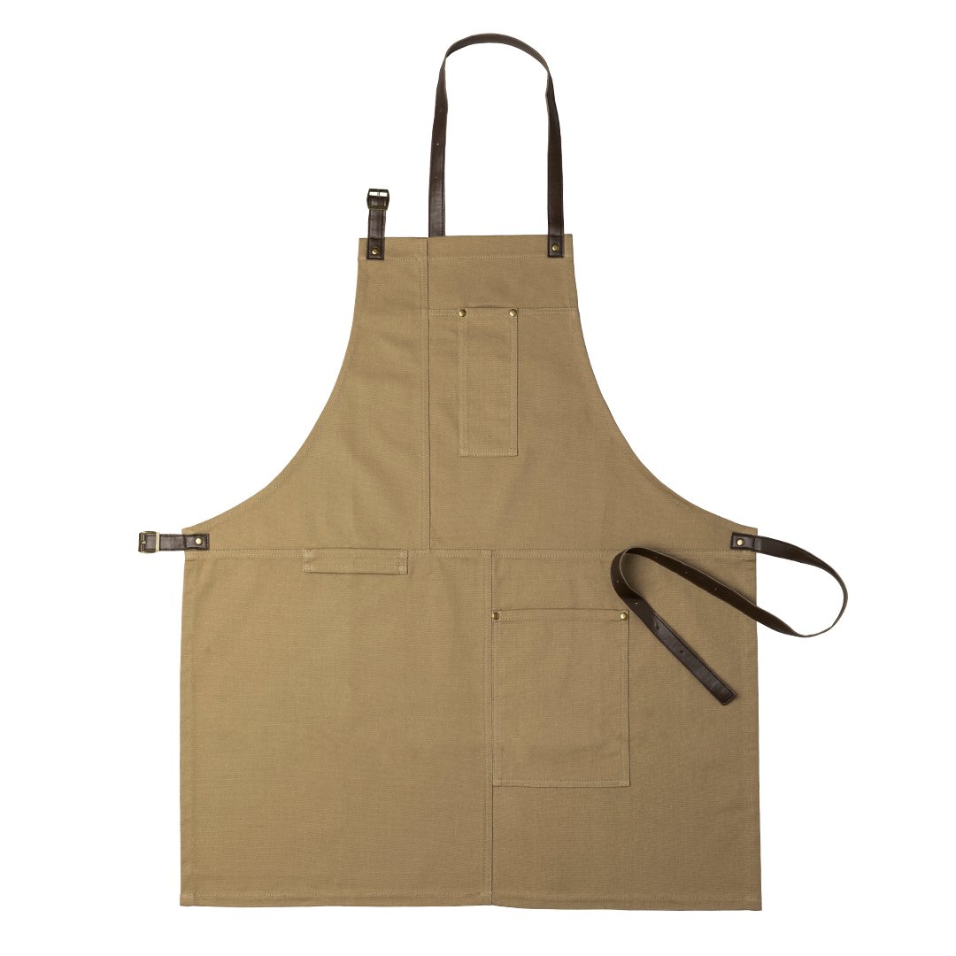 Delantal pro de alta calidad en resistente material 100% algodón canvas de 340g/m2. De corte por debajo de la rodilla, con cintas de cuello y cintura en resistente polipiel con ajuste mediante hebilla y reforzado con remaches metálicos. Incluye multitud de bolsillos para los distintos utensilios, con las costuras reforzadas.