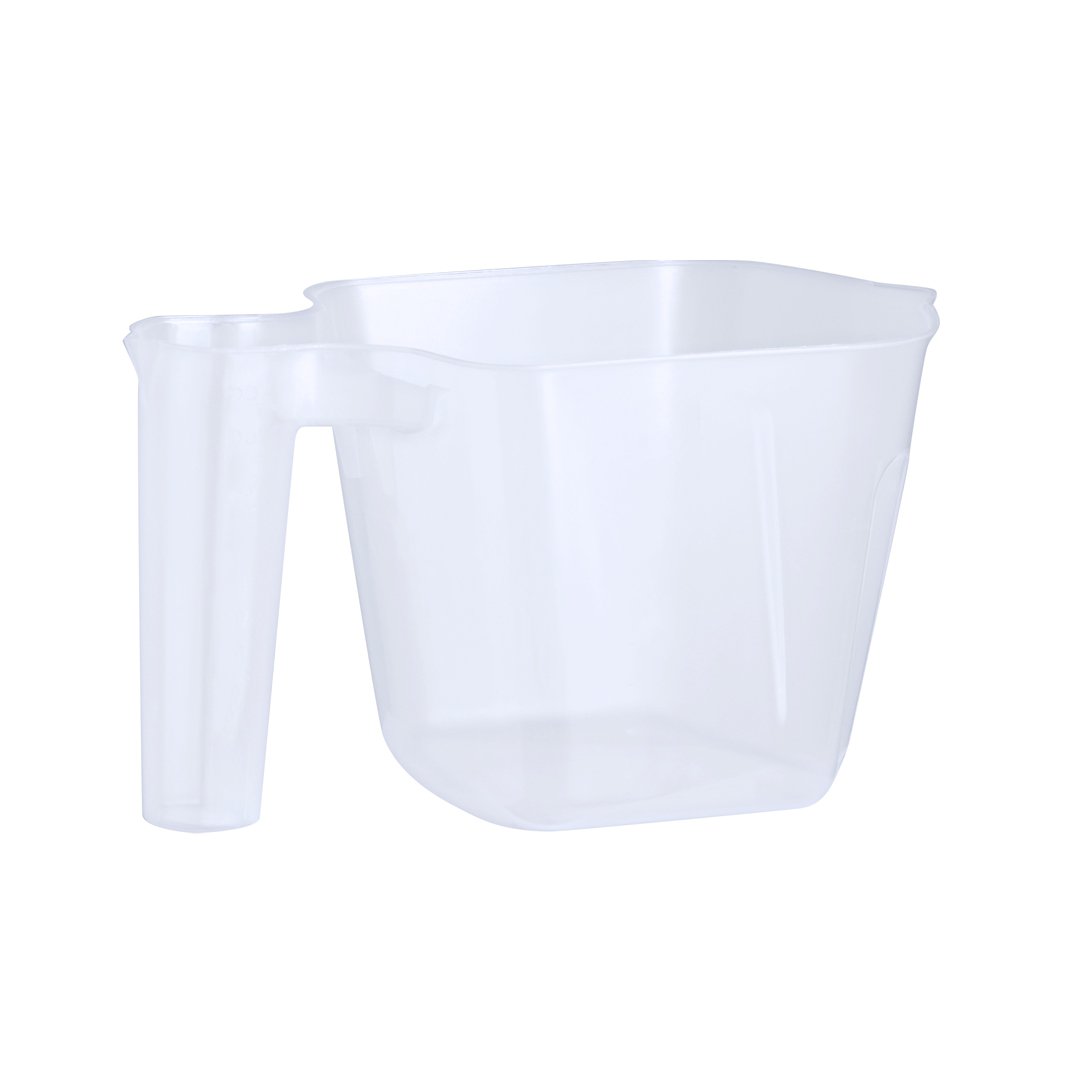 Jarra medidora de 1L fabricada en resistente PP transparente, con asa medidora integrada. Compartimento principal de 1 litro de capacidad, con medidor lateral en tramos en 50 ml. Asa para tomas más precisas, con medidor lateral en tramos de 5 ml. Vertedor para evitar derrames en ambos recipientes.