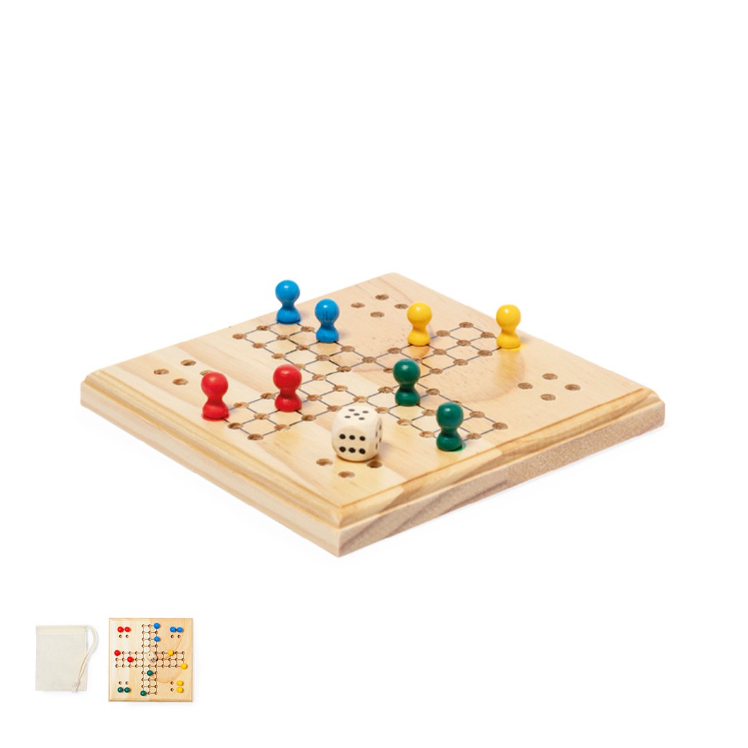 Entretenido juego de parchis fabricado en madera. Contiene un tablero, 16 fichas de 4 colores diferentes y un dado. Para participar entre 2 y 4 jugadores. Con práctica bolsita de algodón para guardar las fichas. Presentado individualmente en caja de diseño kraft.