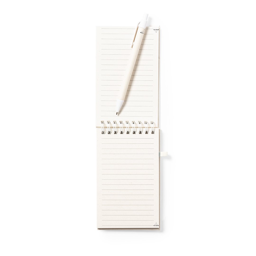 Libreta de tapas duras fabricada a partir de cartones de leche reciclados. Con 80 hojas de disposición a una raya, elástico de sujeción a juego y soporte para bolígrafo. Además, incluye bolígrafo fabricado a juego, con mecanismo pulsador y en tinta azul. Logotipo Recycled Milk Cartón en la esquina de las hojas, contraportada y bolígrafo. Presentada en bolsa individual reciclada.Los cartones de leche se componen en su mayor parte de cartón y aluminio. Durante su proceso de reciclado, se separan los distintos materiales del envase para su reutilización y nuevo uso, contribuyendo así a recorrer el camino infinito de la economía circular. Este material se caracteriza por su alto grado de reciclabilidad, así como por su ligereza y resistencia.