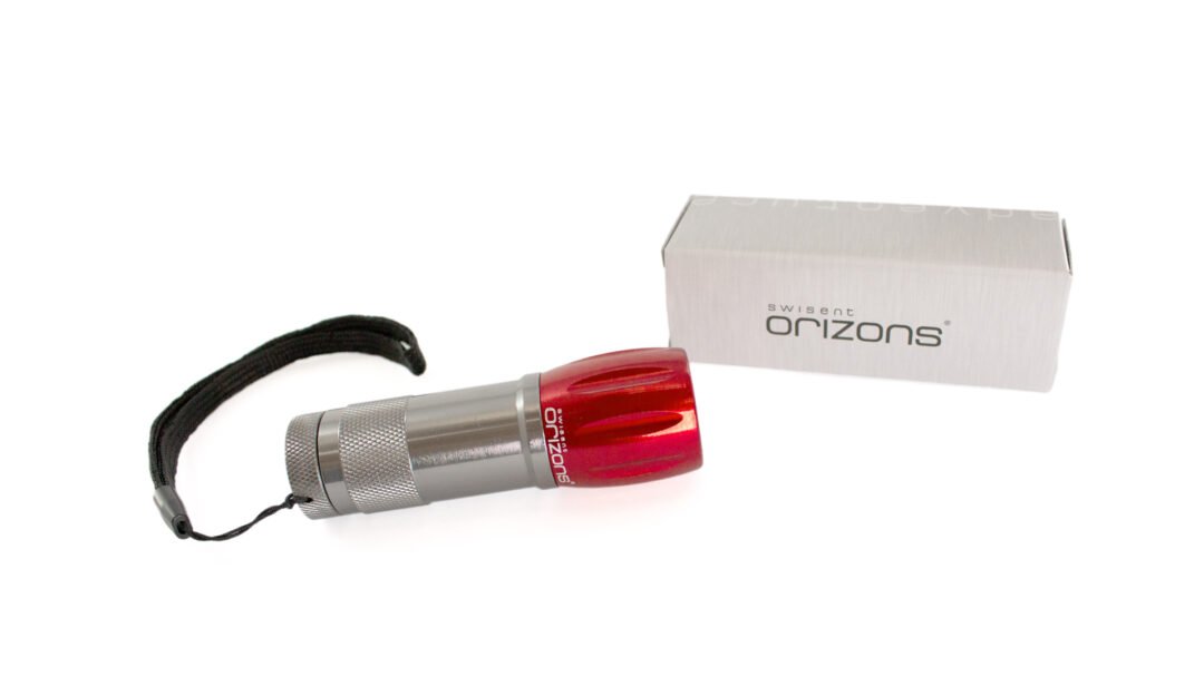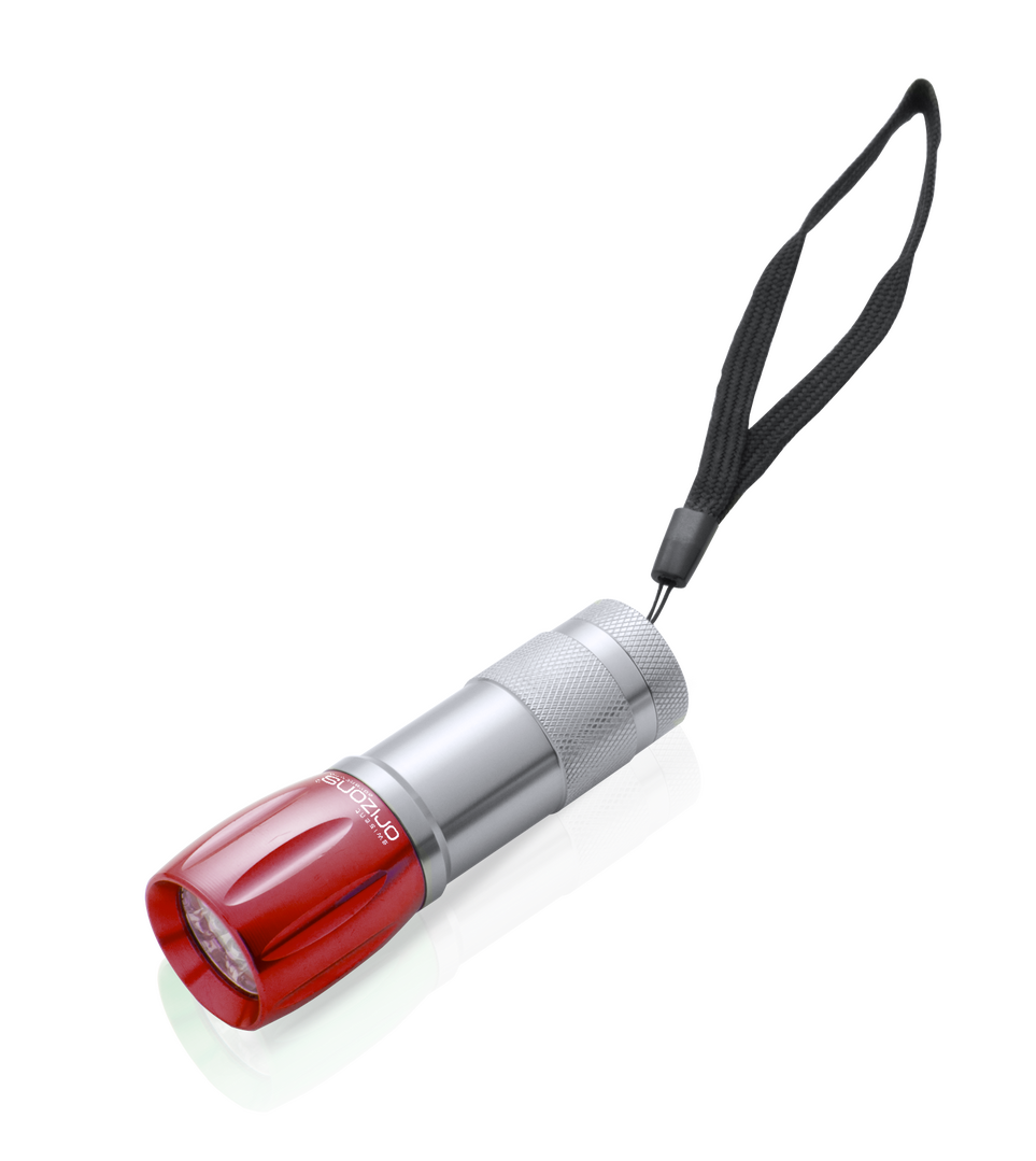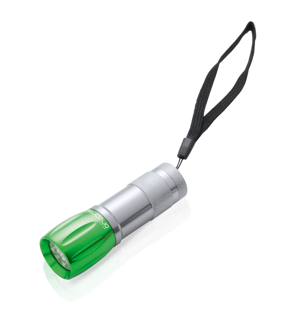 Linterna de Orizons de 9 ledes de alto poder de iluminación. Con resistente cuerpo en aluminio de diseño bicolor con mango antideslizante, pulsador protegido con recubrimiento de resistente goma y cinta de transporte. Alimentación a pilas: 3xAAA no incluidas. Presentada en atractiva caja de diseño con logotipo de la marca.