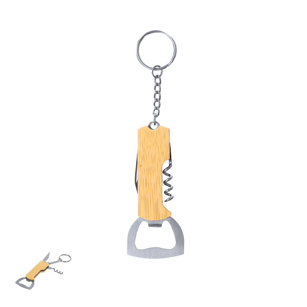 Llavero abridor fabricado en bambú y acero inox, con abridor de botellas y sacacorchos, incluye cuchilla y argolla de metal para llaves.Materiales como el Bambú fomentan la utilización de materias primas naturales reduciendo las emisiones contaminantes. Además, el bambú proviene de una planta de gran resistencia y versatilidad, con crecimiento y regeneración rápida, siendo una excelente alternativa al uso de madera tradicional.