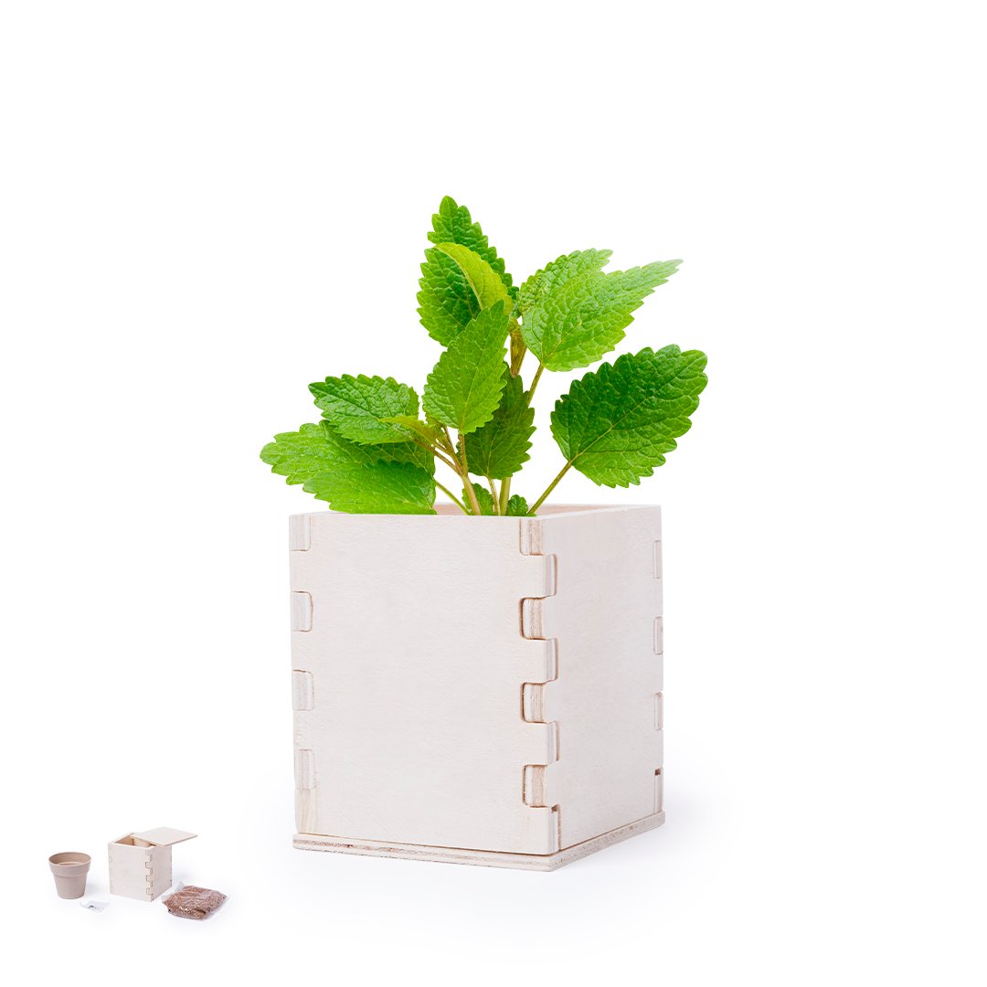 Maceta de menta con macetero de línea nature. Incluye también una original caja de madera para marcaje de logotipo, con 6-8 semillas y sustrato de crecimiento. Presentada en atractiva caja de diseño.