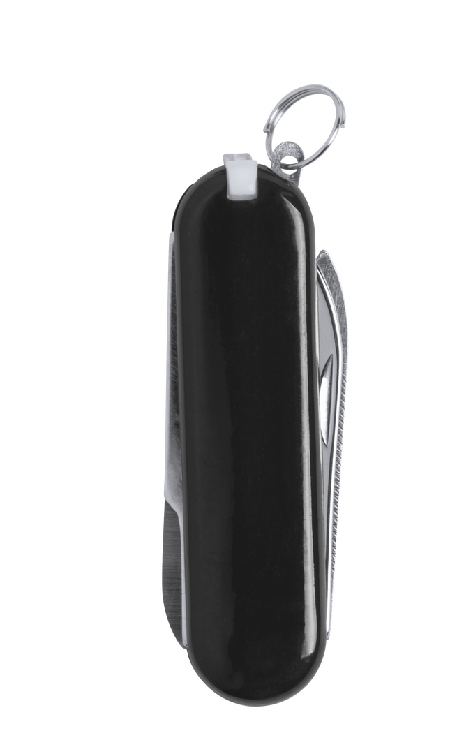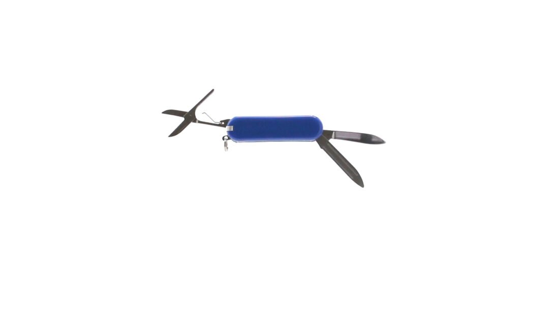 Mininavaja multiusos con accesorios de acero inox, de 6 funciones en variados colores. Incluye navajas, pinzas, lima, palillo, anilla para llavero y tijeras. Presentada en caja individual.