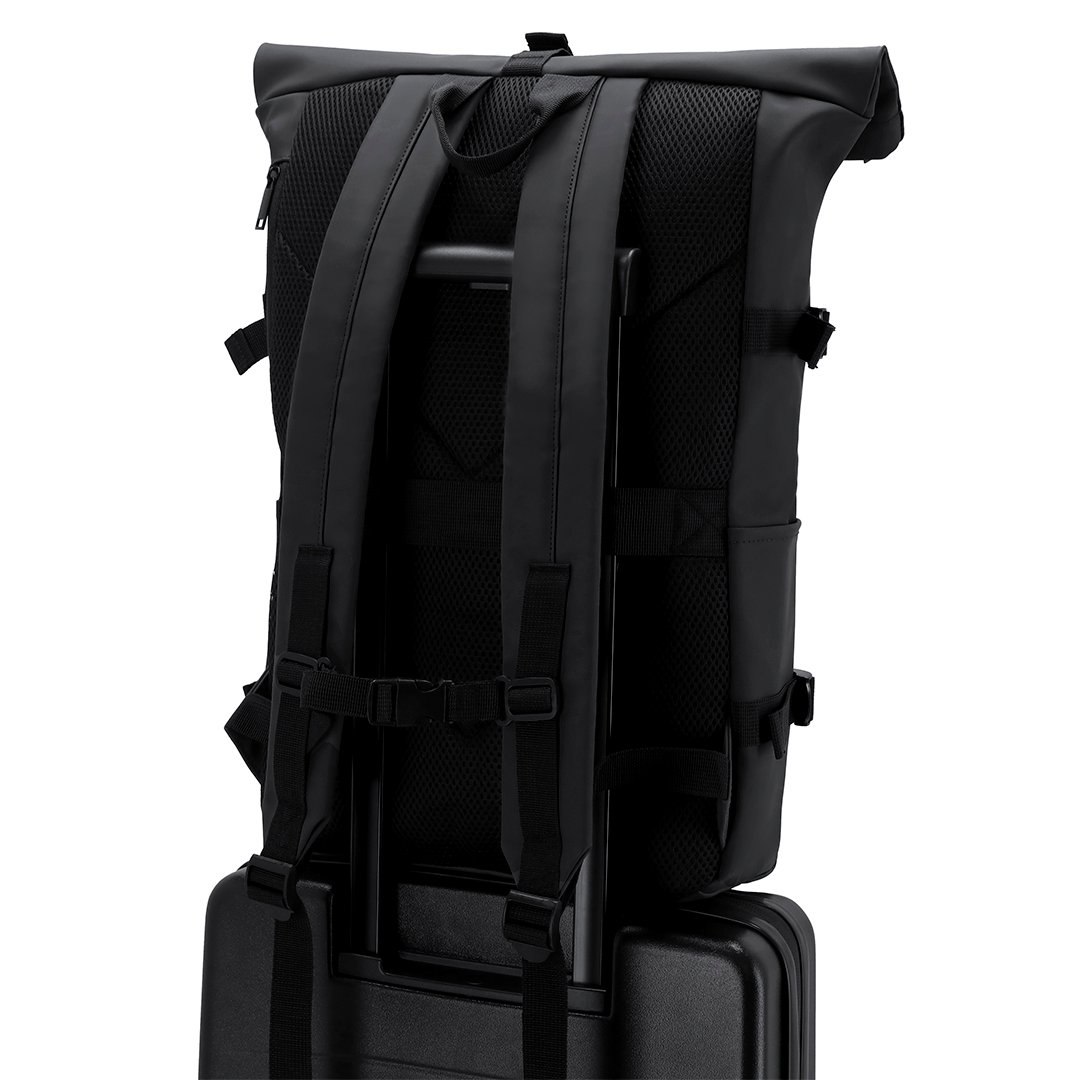 Mochila confeccionada en suave PU con sistema de cierre enrollable con cremallera y hebilla. Dispone de un bolsillo frontal y un bolsillo trasero con acceso lateral, ambos con cremalleras de cierre invisible y dos bolsillos laterales adicionales. Interior de gran capacidad con compartimento acolchado para portátil de hasta 15 pulgadas. Cintas laterales ajustables que permiten compactar el volumen según necesidad. Cintas de hombros en PU y espalda acolchadas para mayor comodidad. Cuenta con correa pectoral con hebilla para un ajuste seguro. Incluye cinta trasera para ajuste en trolley o maleta, ideal para viajes y desplazamientos.