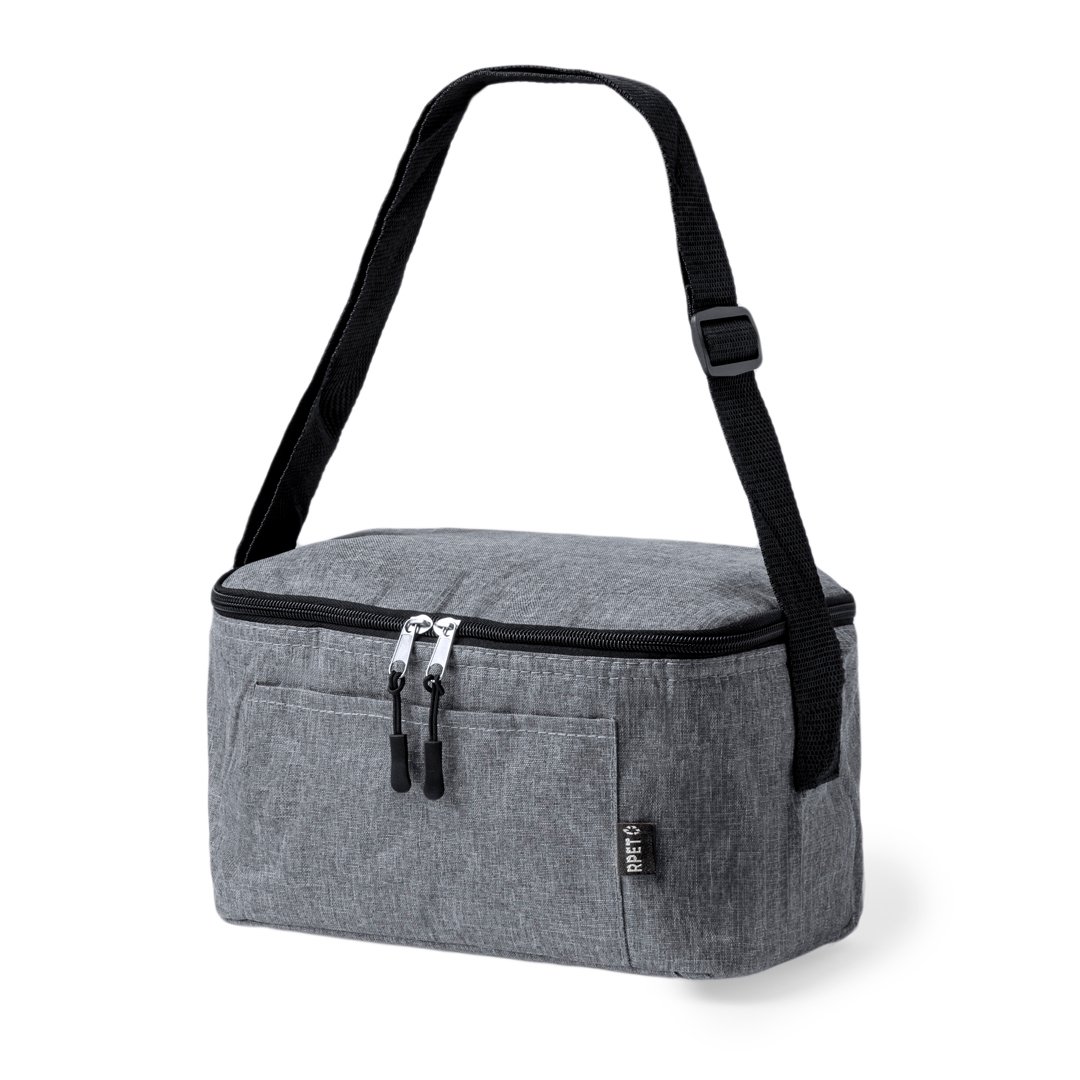Nevera confeccionada en resistente poliéster 600D RPET con un atractivo efecto melange. Su compartimento principal cuenta con cierre de cremallera y forro interior de aluminio. Además, incorpora un práctico bolsillo exterior y una cinta bandolera ajustable, destacando el logotipo RPET en la etiqueta exterior. Incluye fiambrera con dos compartimentos de 700 ml y cubiertos fabricados en PP reciclado de color negro. Presentado de manera individual en una bolsa reciclada.El material RPET se elabora a partir de plástico reciclado, para así fomentar la reutilización de residuos plásticos y ayudar a la sostenibilidad del planeta.