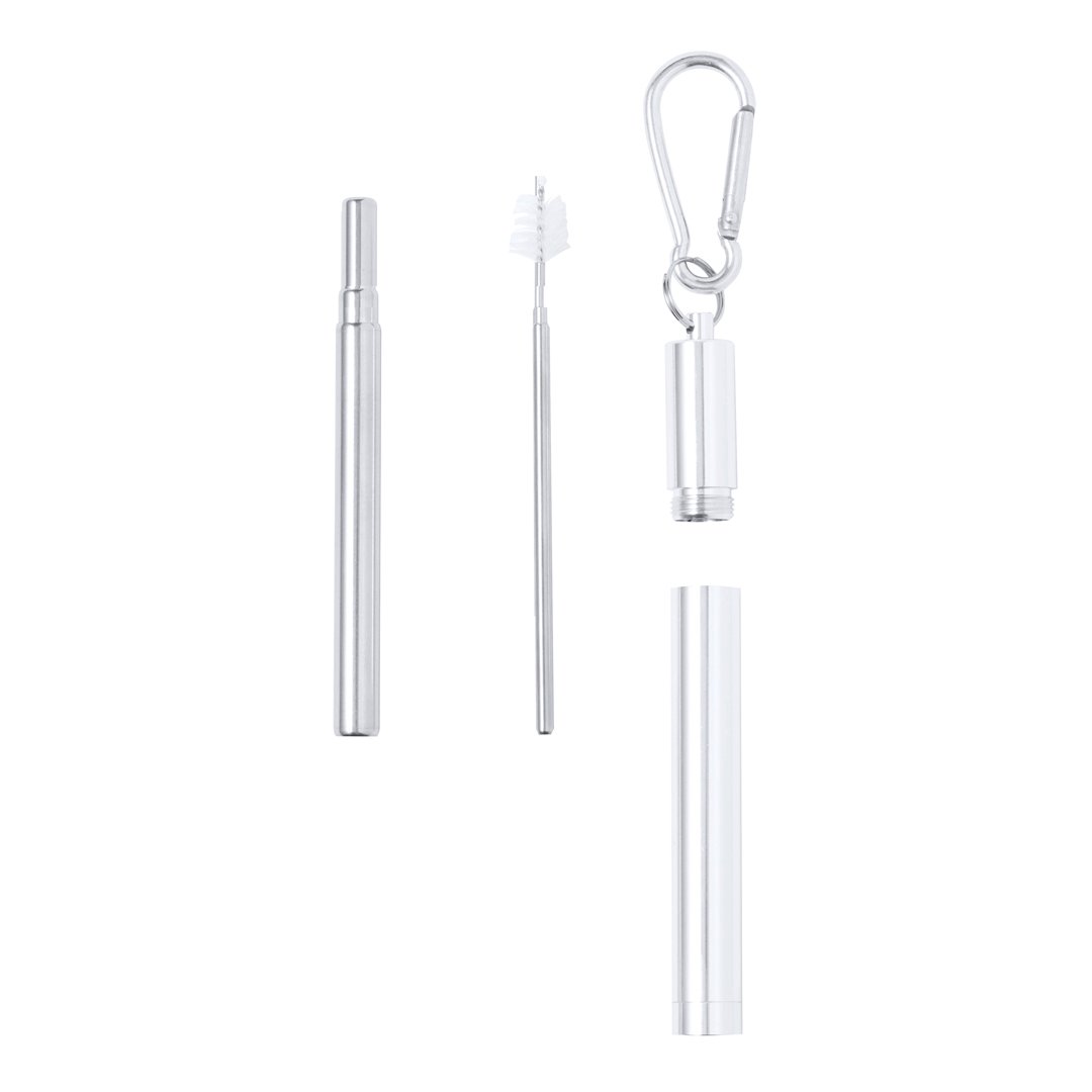Pajita reutilizable y extensible en acero inox, con boquilla de silicona. Con accesorio limpiador incluido y presentada en estuche a juego con mosquetón para transporte.