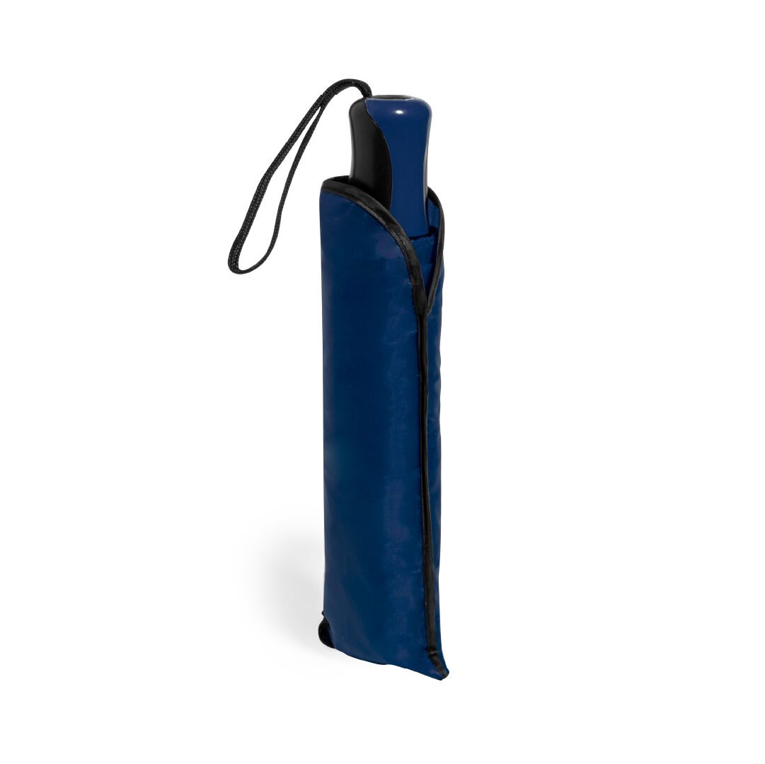 Paraguas plegable de 8 paneles de poliéster 190T. De apertura manual, con varillas metálicas en color plateado y cierre de velcro. Mango ergonómico con cinta de transporte y funda protectora a juego. Disponible en amplia gama de colores. Presentado en bolsa individual reciclada.