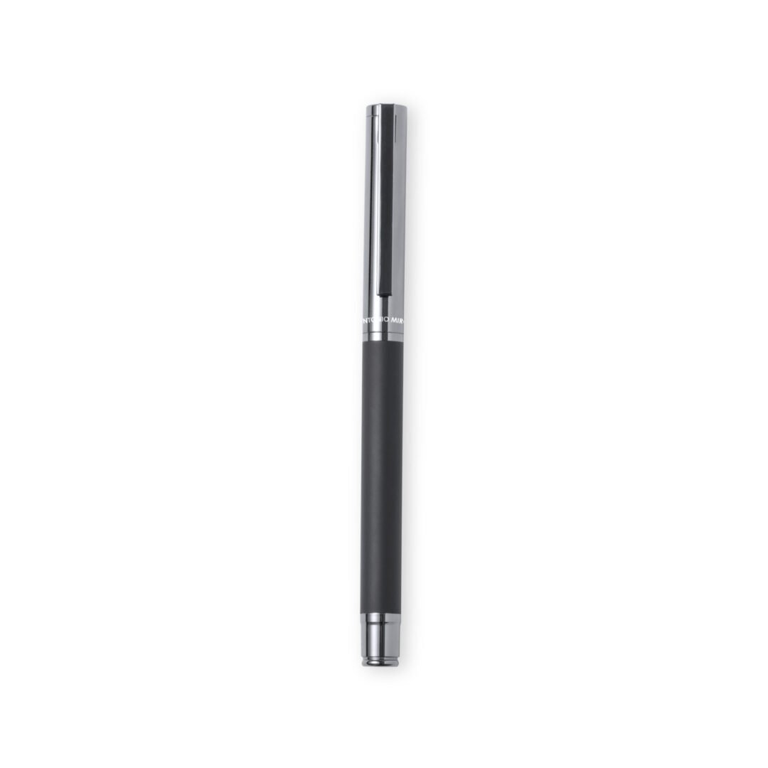 Roller de Antonio Miró fabricado en metal, con cuerpo en negro mate. Detalles y capucha en cromado con logotipo de la marca. De cartucho jumbo y en tinta azul. Presentado en elegante y resistente caja individual negra con logotipo Antonio Miró y funda a juego.