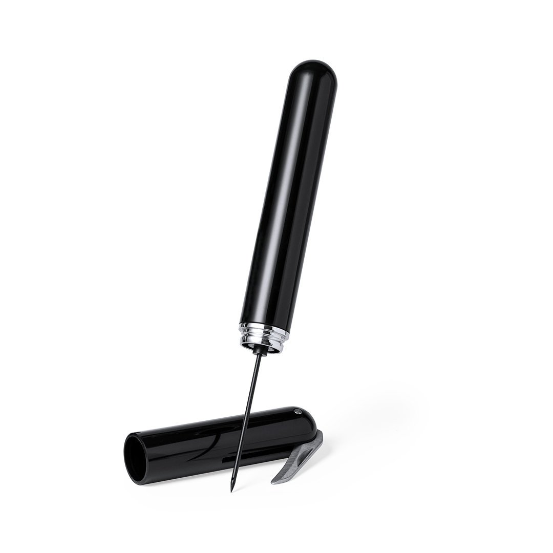 Sacacorchos con bomba de aire integrada, para una extracción del tapón de corcho fácil y segura. Fabricado en resistente material ABS y con cortacápsulas. Presentado en atractiva caja individual de diseño.