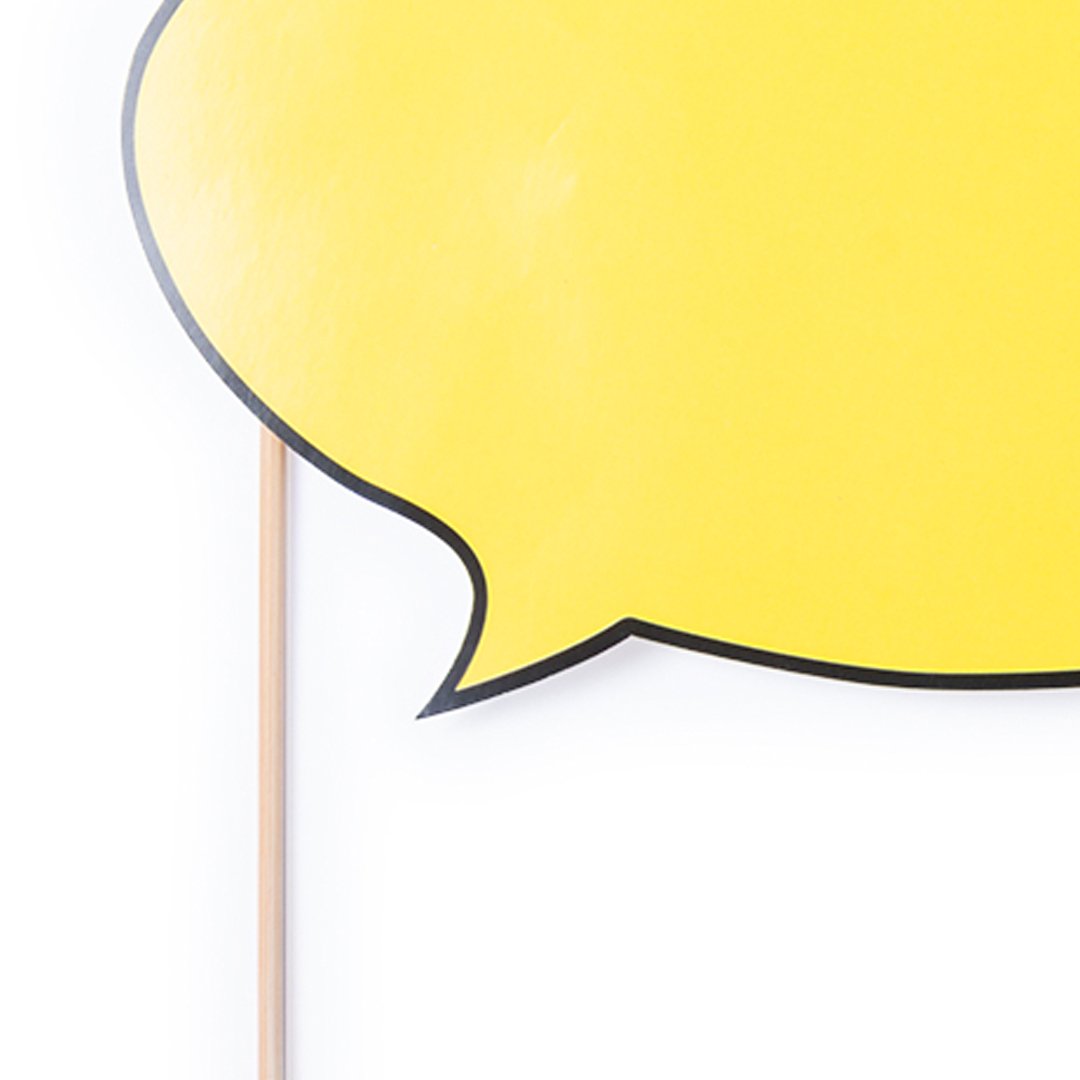 Selfie bocadillo en llamativo color amarillo con amplia superficie de impresión. En papel de alto gramaje con mango de madera.