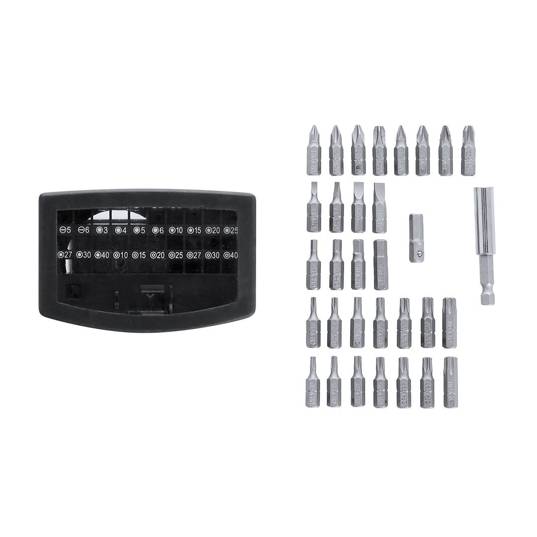 Práctico set de herramientas con estuche fabricado en ABS. Incluye un adaptador de precisión con 32 accesorios magnéticos, compuesto por diversas puntas: philips, estrella, planas, hexagonales y torx.