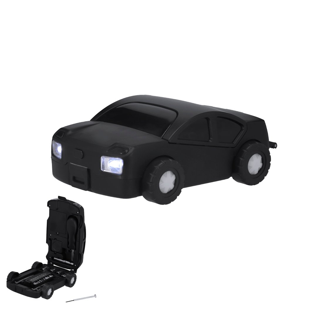 Set de herramientas con estuche en forma de coche y linterna LED. Con 20 herramientas. Incluye: – Set de destornilladores de precisión (planos y philips)- Herramienta de fijación- Mango multifunción con cabezales de destornilladores planos y de estrella-Llaves para tuercas de cabeza hexagonal-FlexómetroCon linterna con 2 LEDs integrada en el escuche, alimentada por 4 pilas AAA (no incluidas).