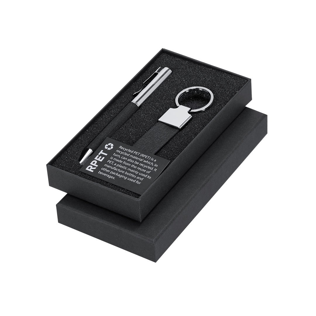 Elegante set en RPET con acabado negro bitono y detalles metálicos. Incluye:-Bolígrafo de RPET de acabado negro bitono y detalles metálicos. Con mecanismo giratorio y tinta azul.-Llavero en RPET de acabado color negro bitono y accesorios cromados.Presentado en estuche individual negro. Incluye tarjeta negra interior con distintivo RPET.El material RPET se elabora a partir de plástico reciclado, para así fomentar la reutilización de residuos plásticos y ayudar a la sostenibilidad del planeta.