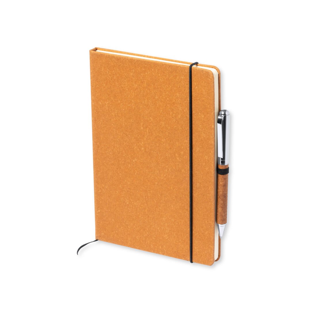 Set de bloc de notas y bolígrafo en cuero reciclado. Incluye: Bloc de notas con tapas rígidas fabricadas en cuero reciclado. Interior con 100 hojas de disposición a una raya. Incluye marcapáginas, elástico de cierre y soporte para bolígrafo a juego. Con distintivo cuero reciclado en contraportada.Bolígrafo fabricado en metal cromado y con cuerpo recubierto en cuero reciclado. Elegante clip metálico y accesorios a juego. De mecanismo giratorio y en tinta azul, con distintivo cuero reciclado en cuerpo.Set presentado en estuche individual de diseño kraft, con compartimento independiente para bloc de notas y bolígrafo.El cuero reciclado rescata las fibras desechadas en los procesos de fabricación del cuero, minimizando el desperdicio de material, contribuyendo a reducir el impacto ambiental y manteniendo a la vez sus propiedades originales.