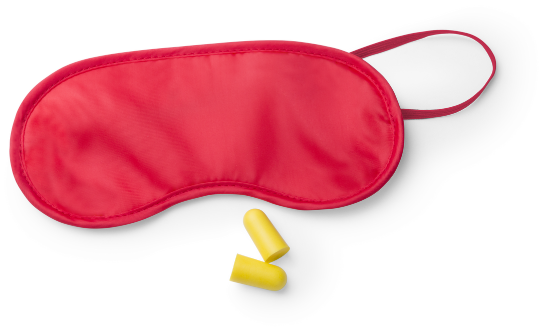 Set de viaje de mascarilla y tapones para oídos. Mascarilla en suave y confortable microfibra de vivos colores con elástico de ajuste a juego. Tapones en confortable material EVA de color amarillo. Presentado en bolsa individual.