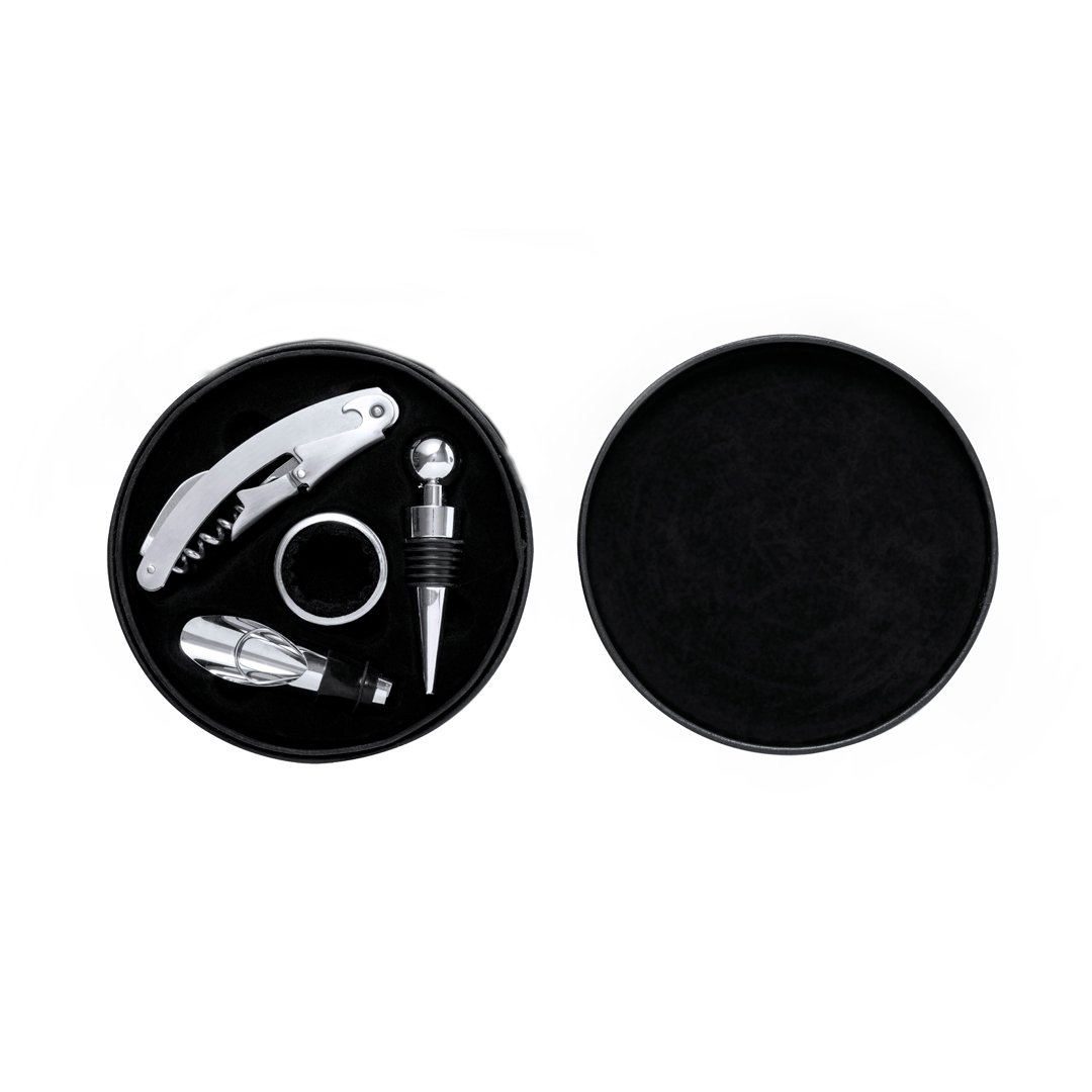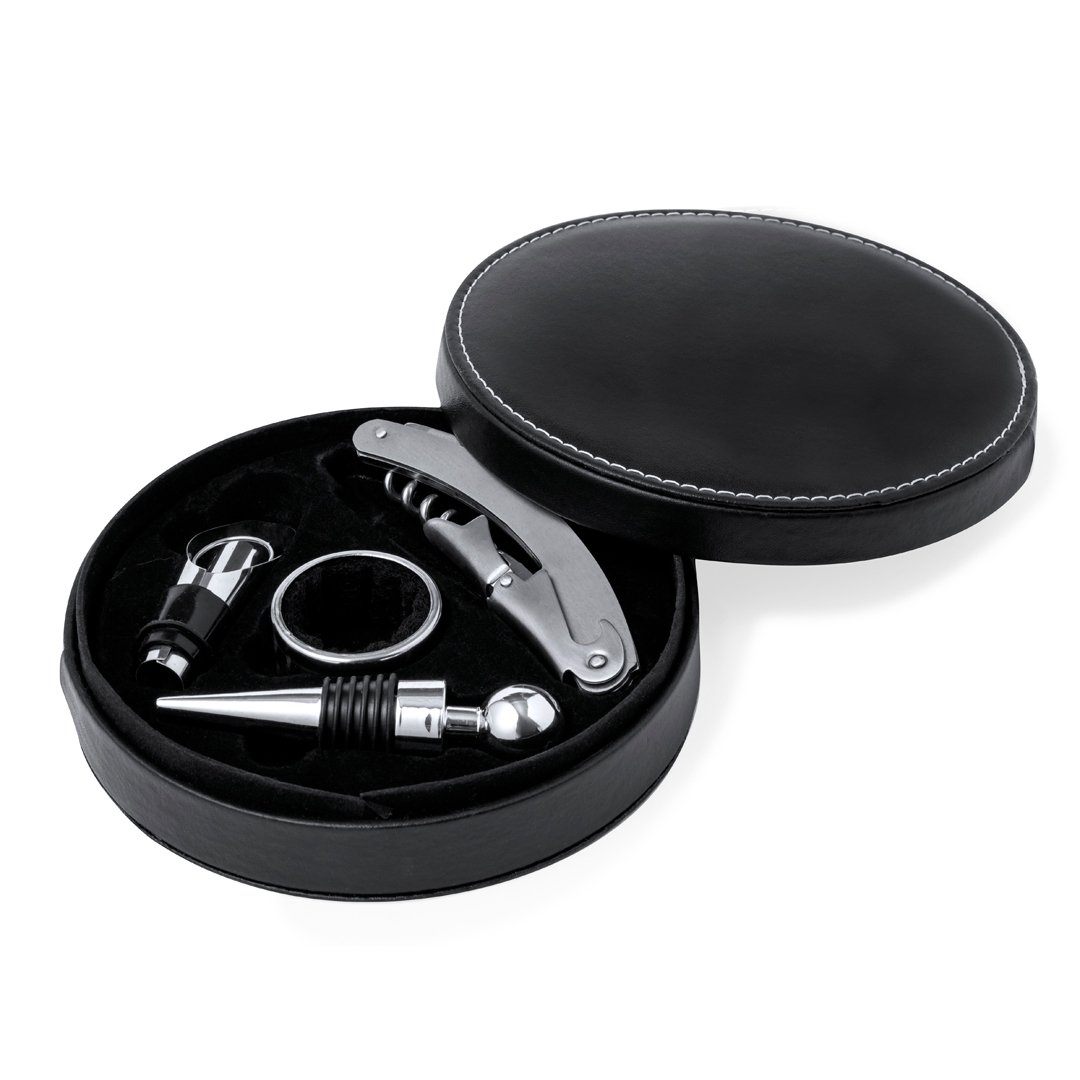Set de vinos de elegante diseño circular acabado en polipiel, con accesorios de acero inox. Incluye sacacorchos de 2 tiempos con cortacápsulas y abridor; tapón, dosificador y recogegotas. Presentado en estuche individual de polipiel con interior en suave espuma troquelada de color negro.