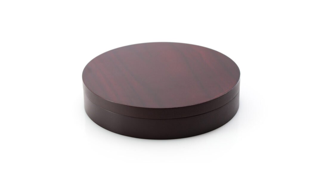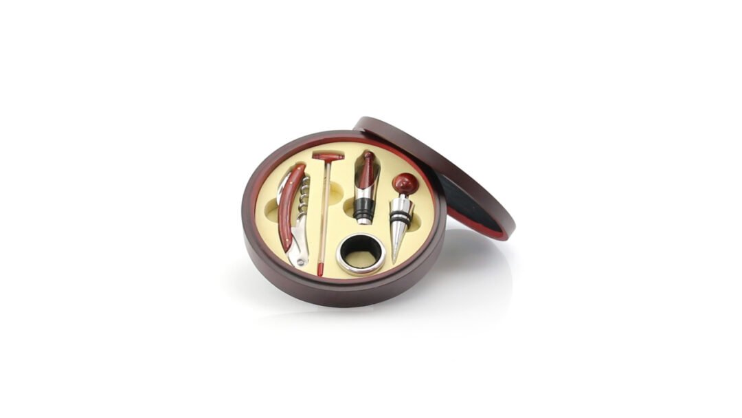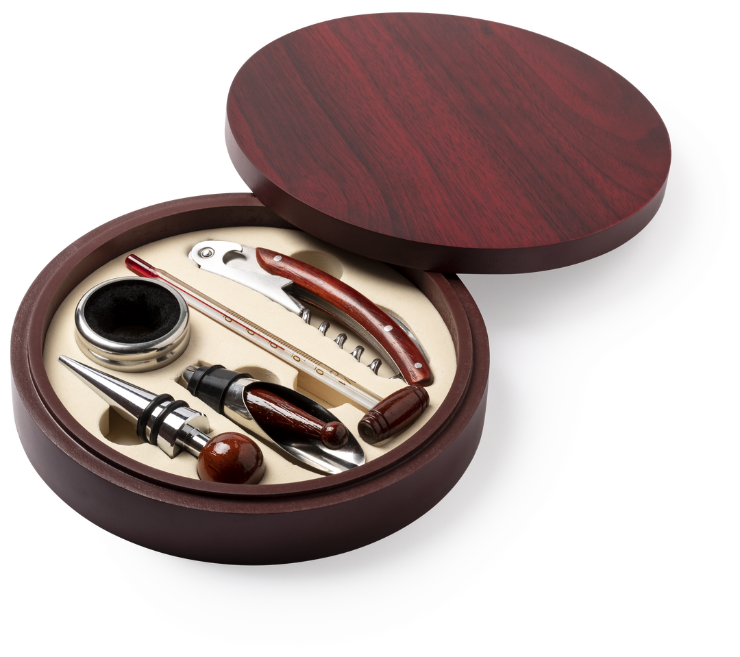 Set de vinos de elegante diseño circular con acabado en madera natural. Accesorios de acero inox y madera. Incluye sacacorchos con cortacápsulas y abridor, tapón, dosificador, recogegotas y termómetro. Presentado en estuche individual con interior en suave espuma troquelada de color beige.