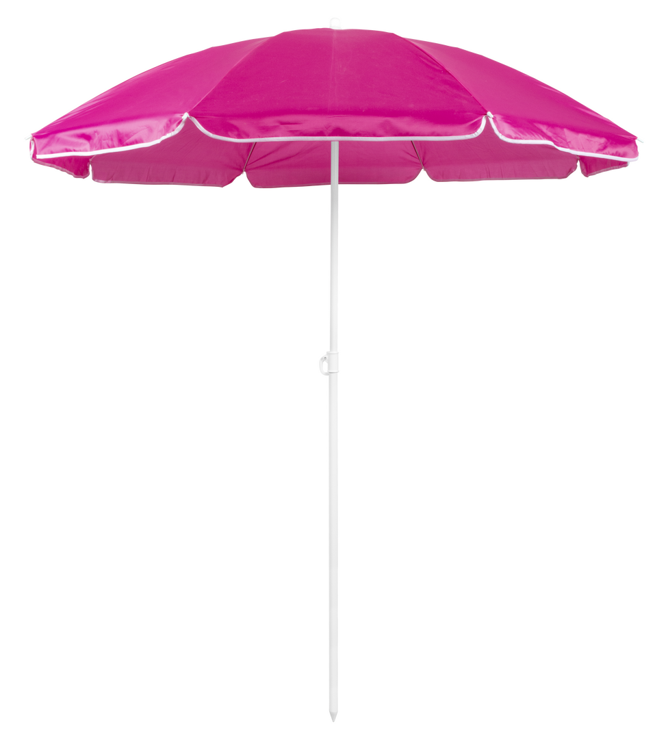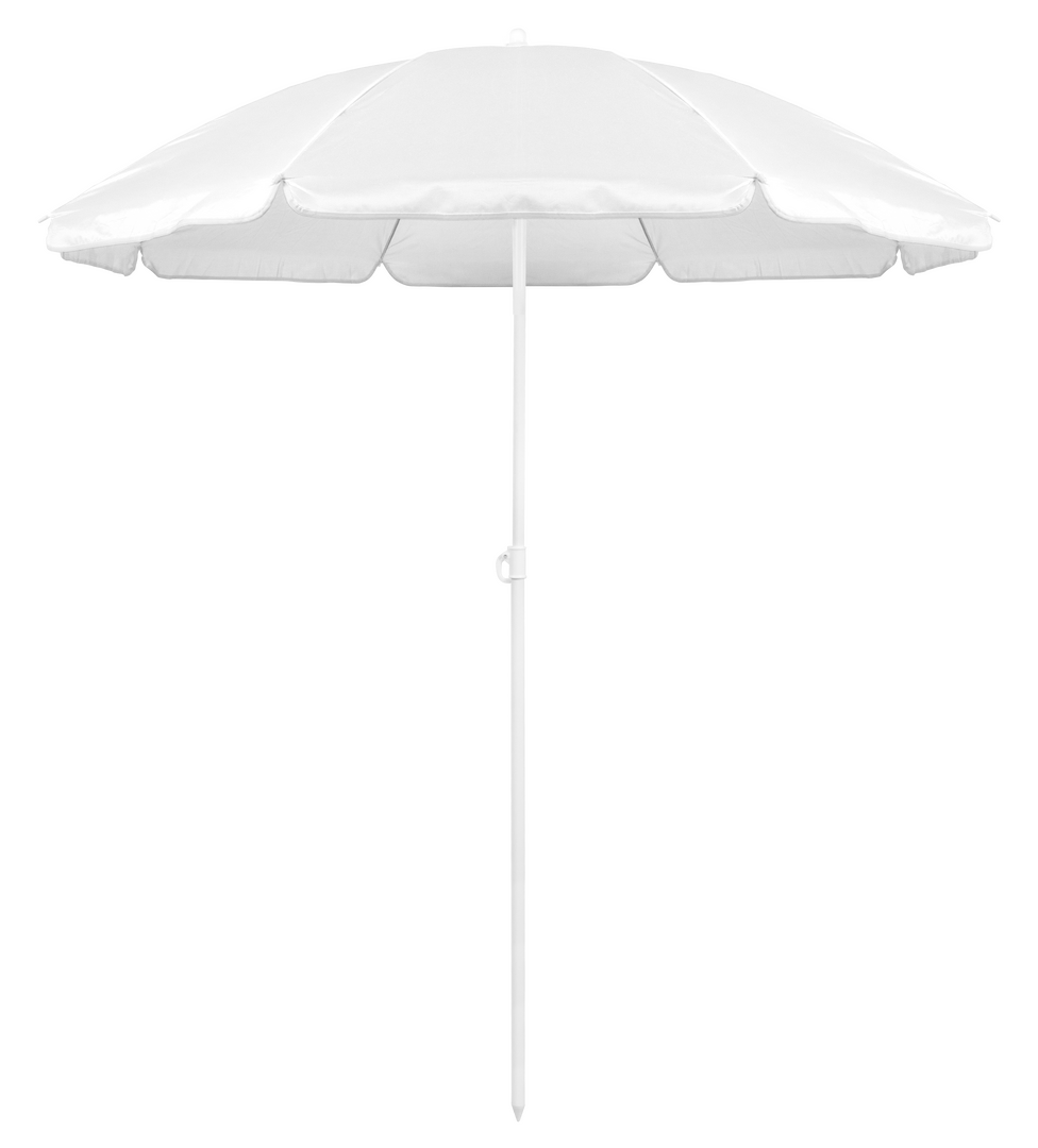 Sombrilla de playa de 8 paneles de resistente nylon en variada gama de vivos colores. De 150cm de diámetro, con faldones laterales ribeteados, tubos metalizados en color blanco y ajustable en altura. Presentada en funda de PVC con cinta de transporte para hombro.