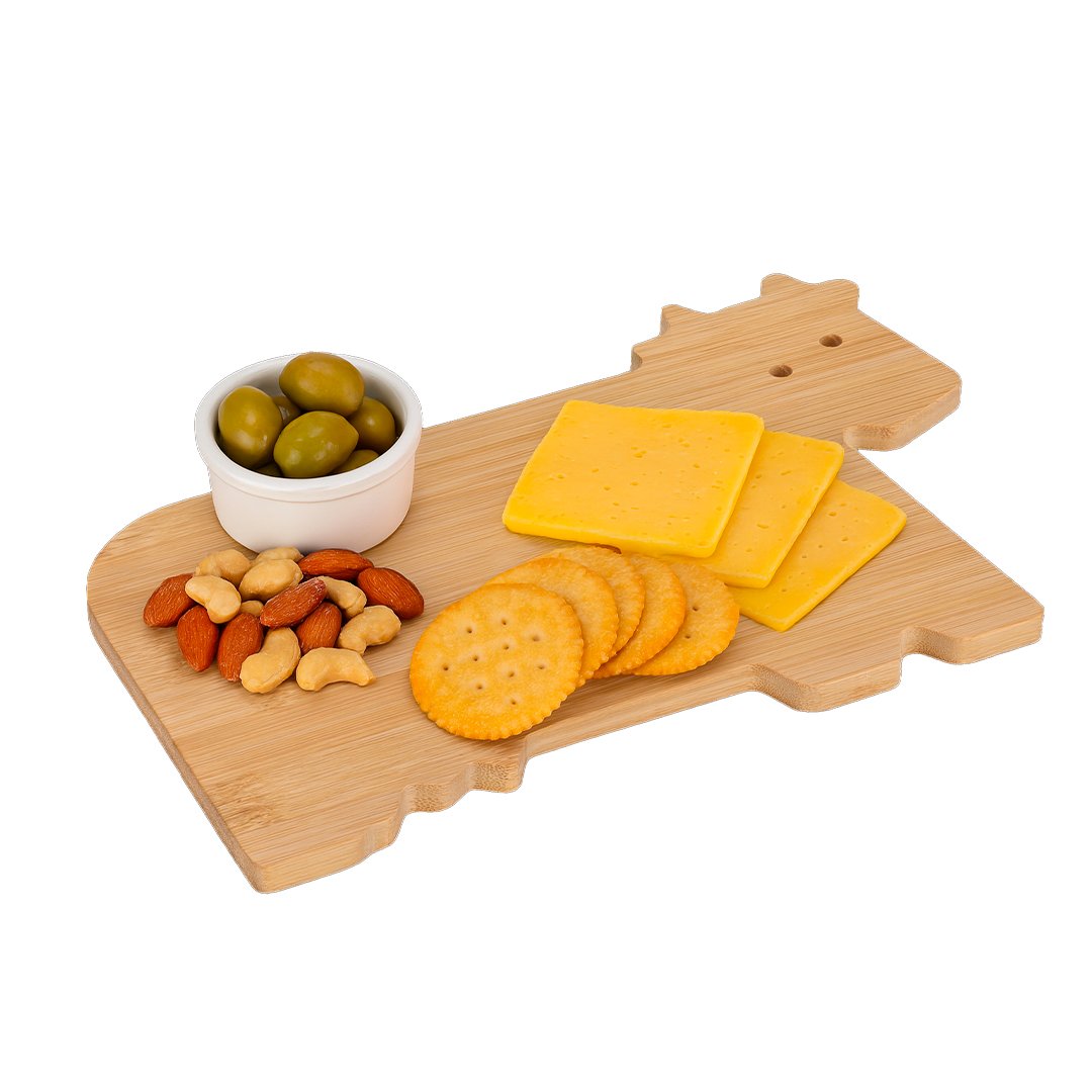 Tabla de cocina con original diseño en forma de vaca, fabricada en suave bambú, muy fácil de limpiar y guardar.