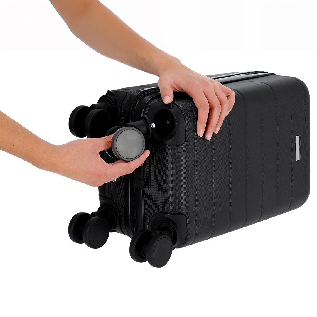 Práctico trolley de 4 ruedas giratorias extraíbles, en rígido ABS. Cierre de cremallera de doble tirador. Interior con compartimentos y diversos. Gracias a su tamaño compacto y a la extracción de las ruedas llevar un trolley como equipaje de manos no será un problema. Incluye bolsa para guardar las ruedas.