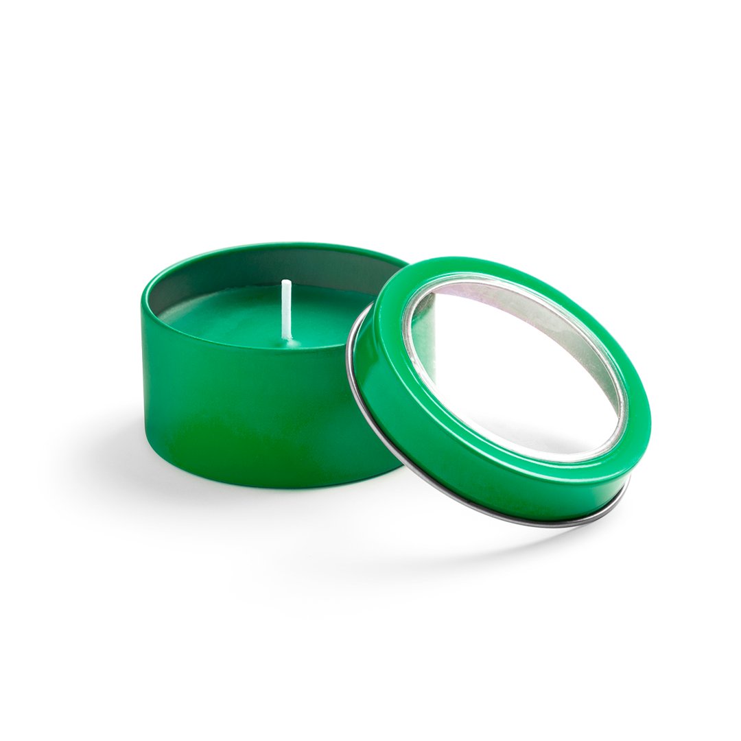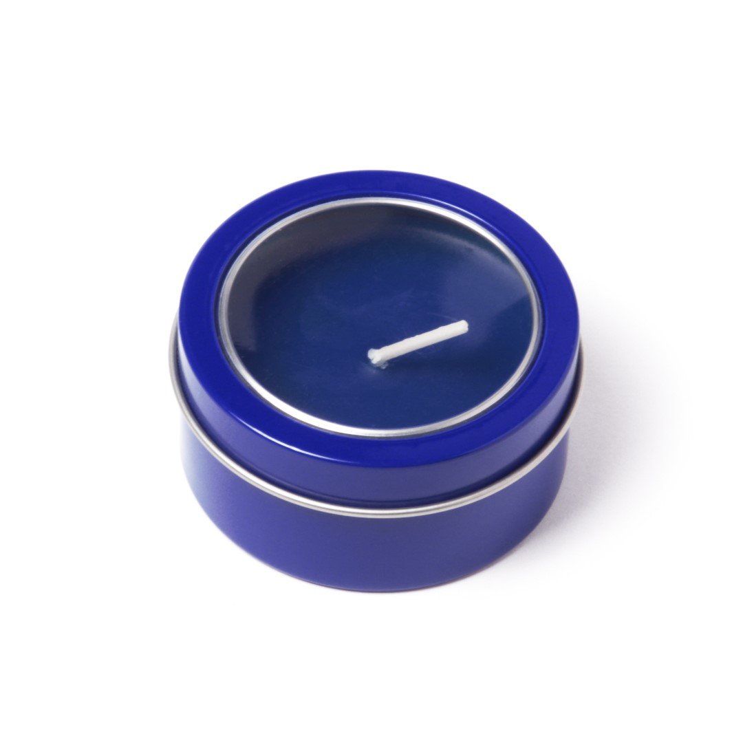 Vela aromática de fragancia vainilla presentada en original tarro metálico con ventana transparente en variada gama de vivos colores.